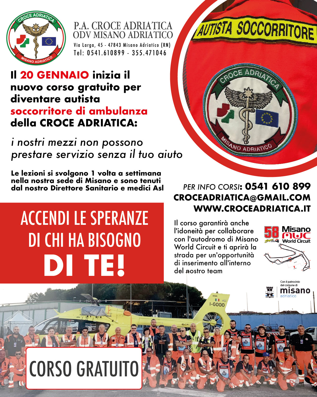 La CROCE ADRIATICA di Misano Adriatico è lieta di annunciare l’inizio del nuovo corso gratuito per la formazione di Autisti Soccorritori di Ambulanza. Il corso avrà inizio il 20 gennaio 2025 e si terrà ogni lunedì sera fino al 24 marzo 2025 presso la nostra sede.